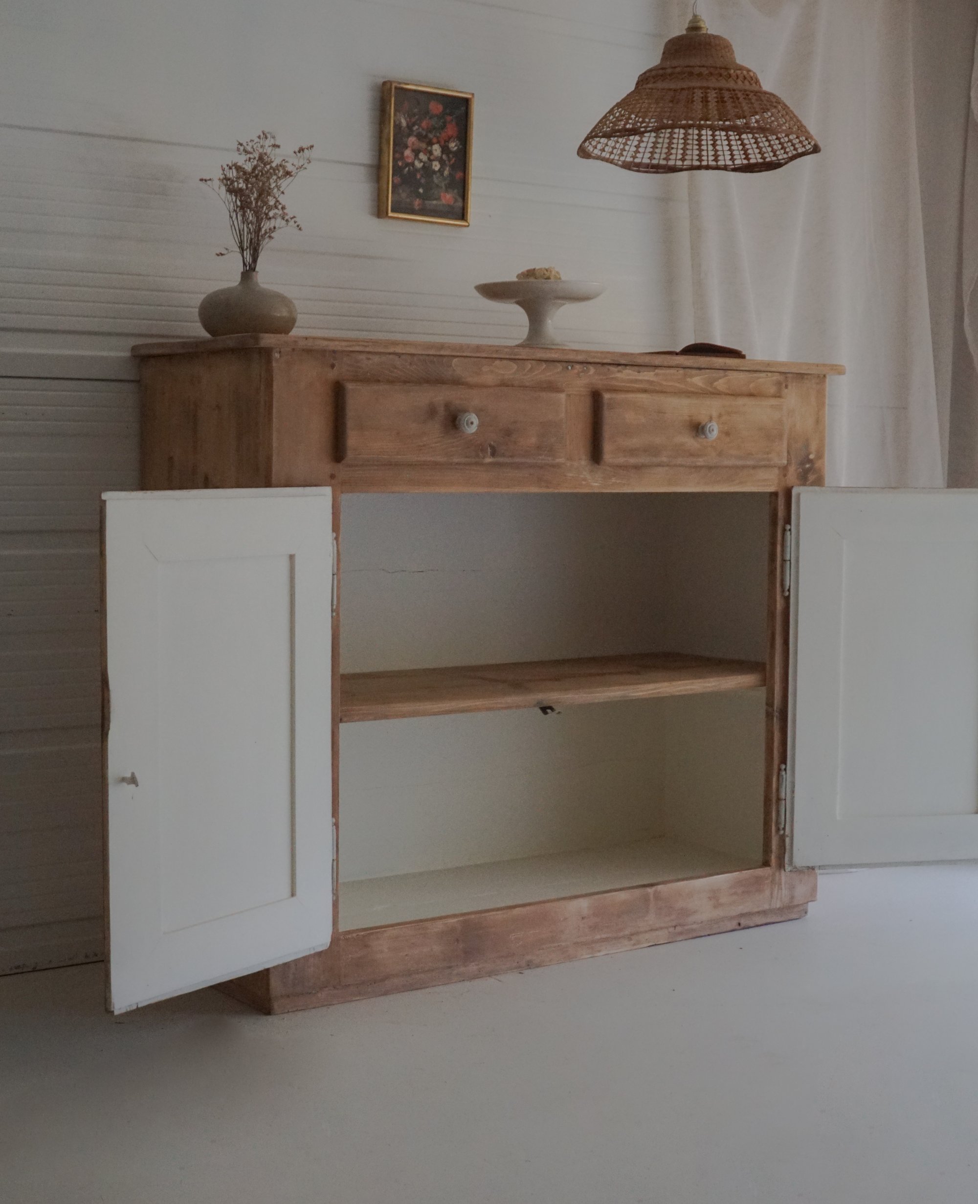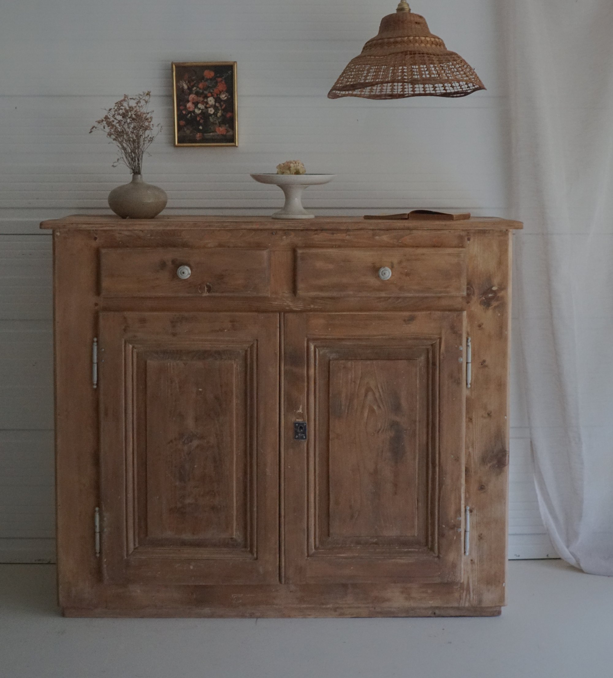 🌿Ancien Buffet parisien / meuble de ferme en bois massif (sapin). Patine et marques du temps - Poignées et visseries volontairement laissés dans sa teinte d’origine . Intérieur du meuble coloris « Blanc / beige dentelle » - Le meuble possède 1 étagère intérieur en bois brut sa Clé d’origine et 2 tiroirs .