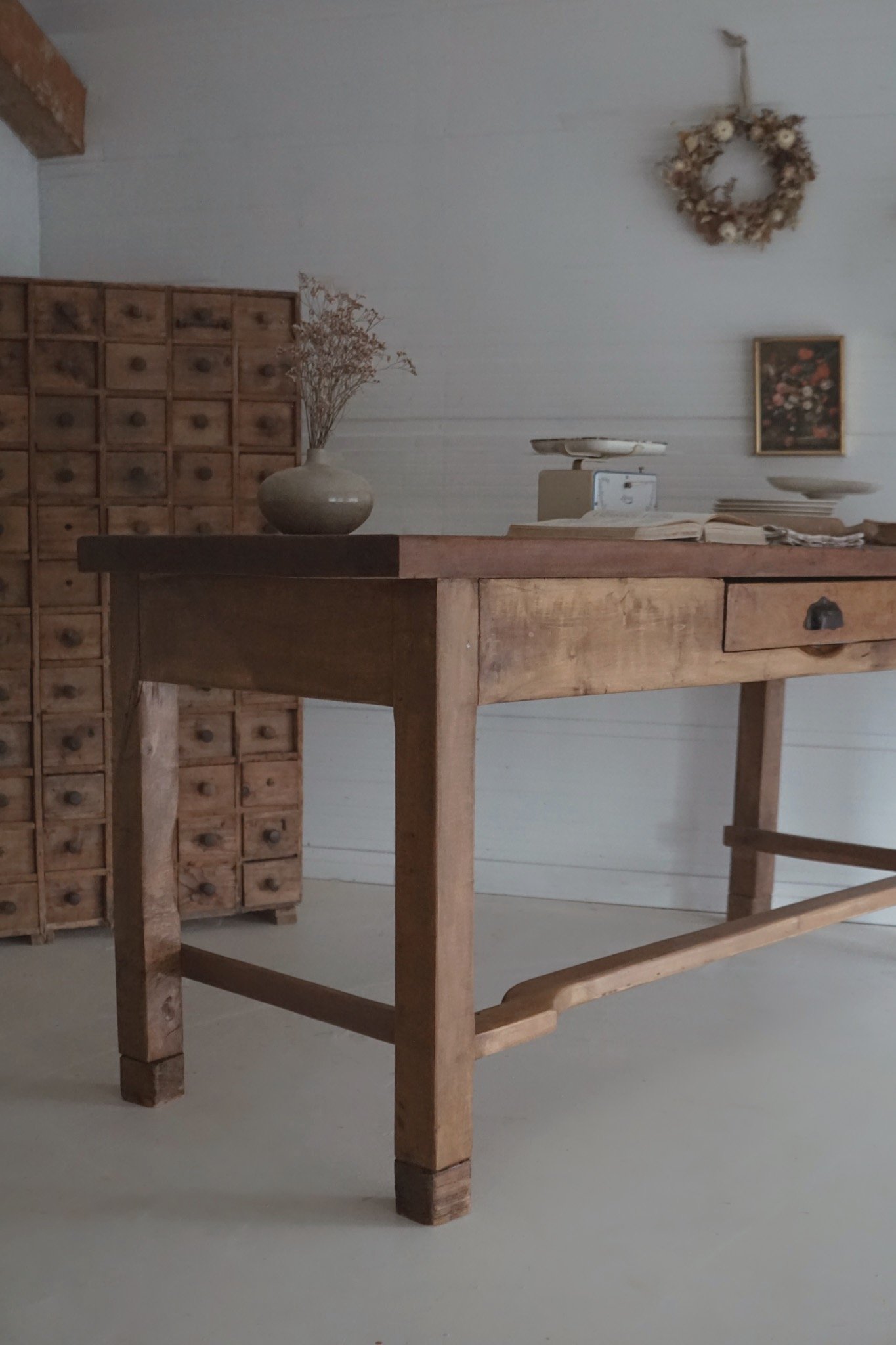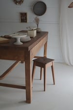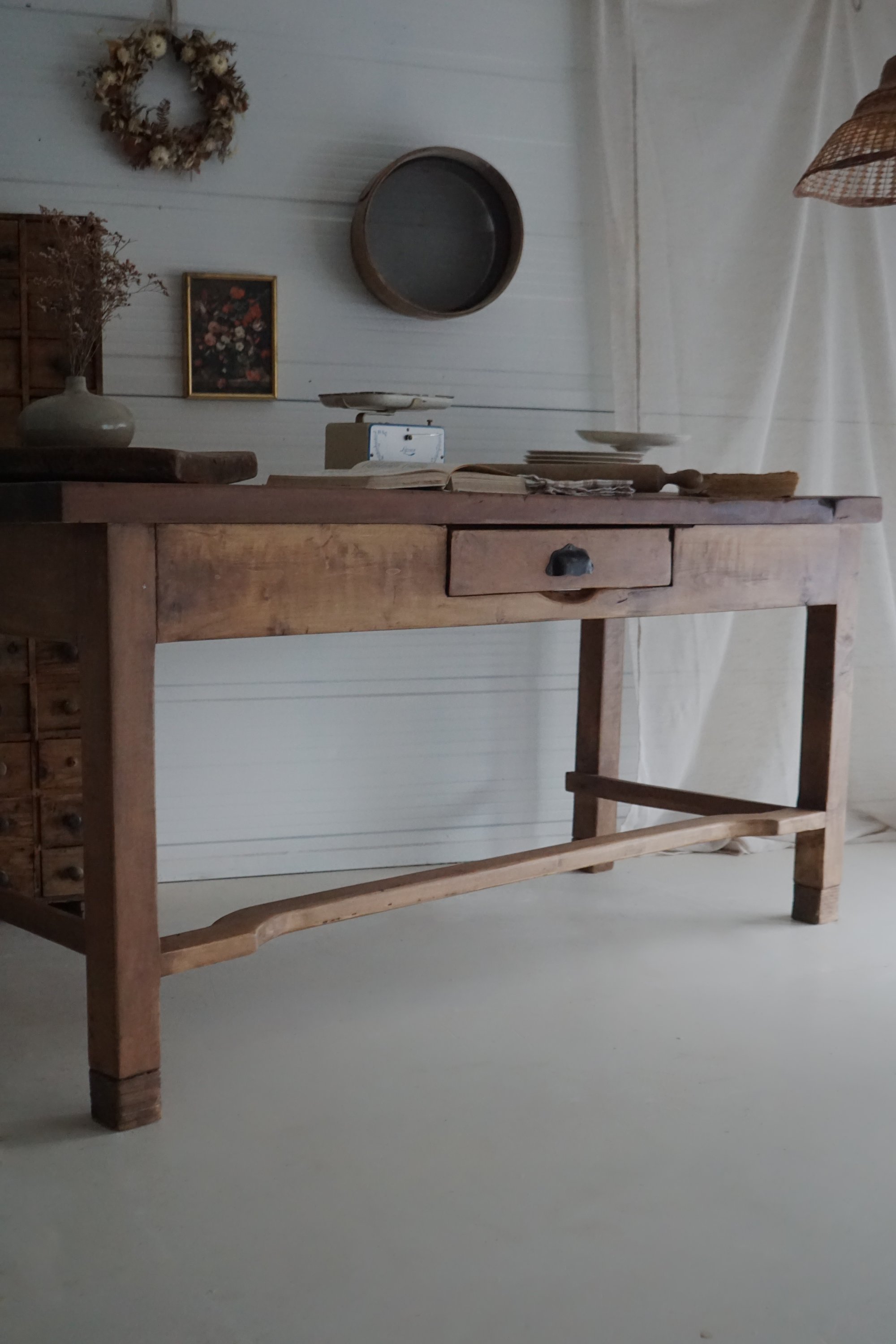 ⁃ Plateau en chêne massif marqué par le temps et l’usure - huilé avec une huile spécial plan de travail aux normes alimentaires - Les anciens écartements naturels du bois ont été soigneusement rebouchés afin d’éviter que les miettes ou résidus ne s’y logent. Cette intervention reste discrète et respecte l’esthétique du plateau tout en le rendant plus pratique à l’usage quotidien.